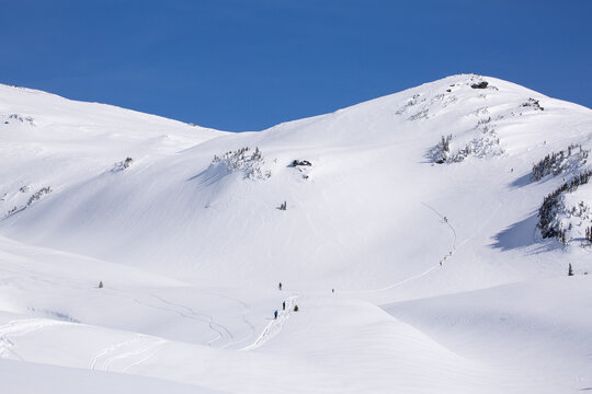 Outdoor enthusiasts make their way up a snowy mountain slope at Mt. Rainier National Park in Washington state
