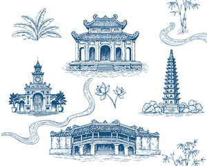 Seamless Vintage Vietnamese wall paper with Ben Thanh Market, Thien Mu Pagoda, Bridge Pagoda, Temple of Literacy in Toile de Jouy style