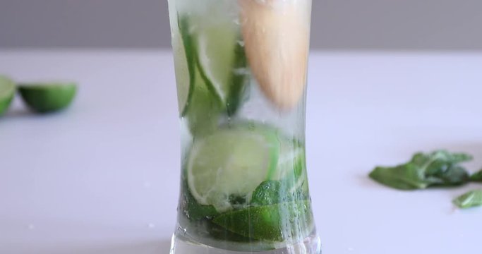 Glass cocktail jar with mixed mint and lime. The process of making mojito. Summer fruit drink.