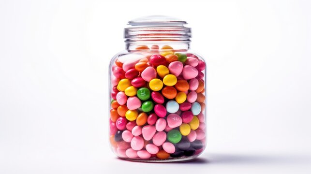Colorful rainbow candies cascade onto a white canvas, creating a playful display of falling jellybeans. Generative Ai.