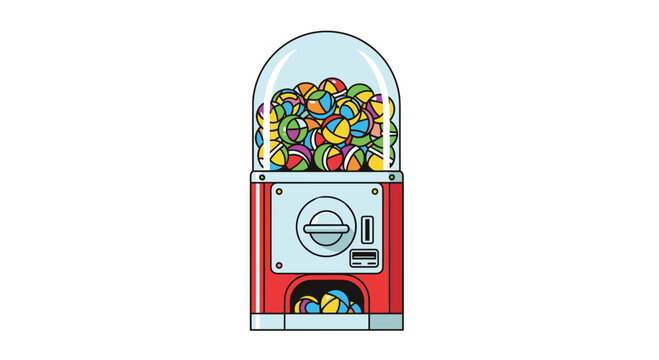 Classic red gumball machine filled with vibrant multi colored toy capsules or candies against a clean white background.