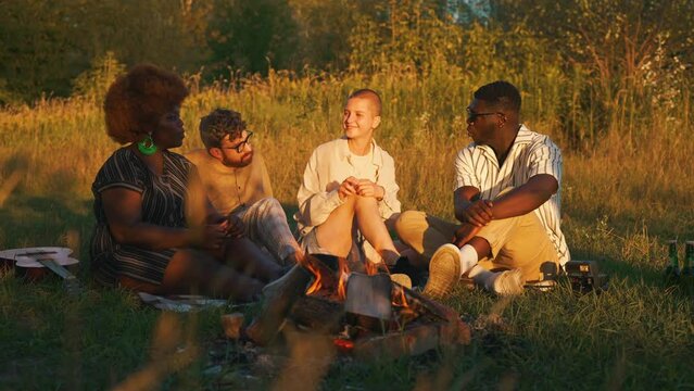 Bonfire concept. Four friends of diverse ethnicities sitting together in the middle of meadow during beautiful sunset enjoying warmth from fire and taking. High quality 4k footage