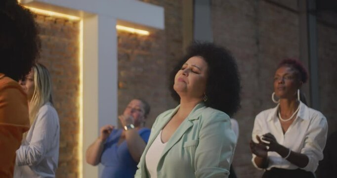Congregation clapping hands in prayer, close-up of diverse women with expressions of devotion and unity, celebrating faith and spirituality in a multicultural gathering