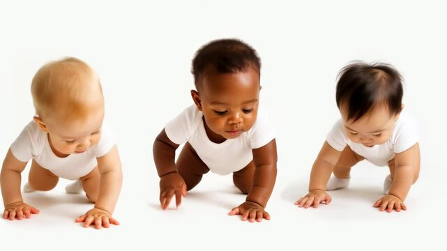 Adorable babies of diverse ethnicities crawling in white outfits. Concept of unity and multicultural childhood,. The kids smiles brightly while moving, hands and feet on the floor.