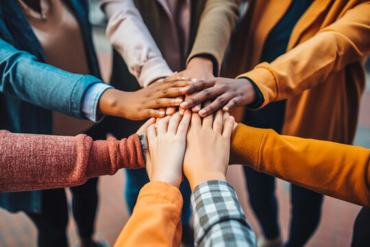 Close up of millennial friends stacking hands together, multiracial diversity, unity