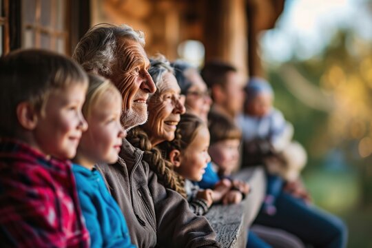 Multi-generation family looking at camera outdoors at dusk, caravan holiday trip.