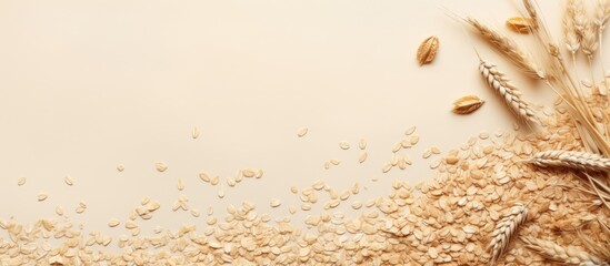 Dry organic multigrain flakes seen from above on a isolated pastel background Copy space