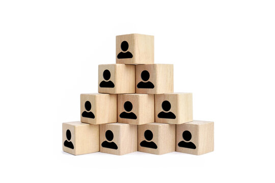 Human Resources, Management hierarchy pyramid with wooden cubes on white. Human resources, corporate hierarchy concept and multilevel marketing , recruiter complete team represented.