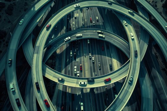 Aerial view of multilevel ring road junction with traffic flow on highway interchange