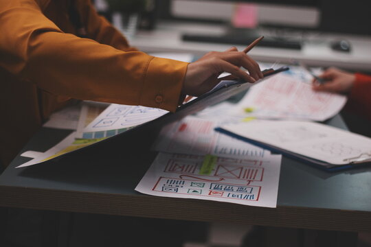 Team of Creative Web, Graphic Designer planning for mobile phone, drawing website ux ui app for mobile phone application and development template layout, process to developing prototype wireframe.