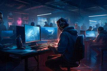 Team of teenage gamers plays in a multiplayer video game on pc in a gaming club.