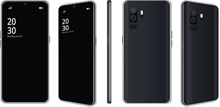 A black smartphone presented from multiple angles including front, back, and side views Vector
