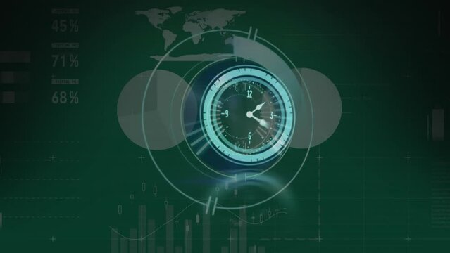 Animation of clock over trading board and abstract pattern against moving vehicles in background