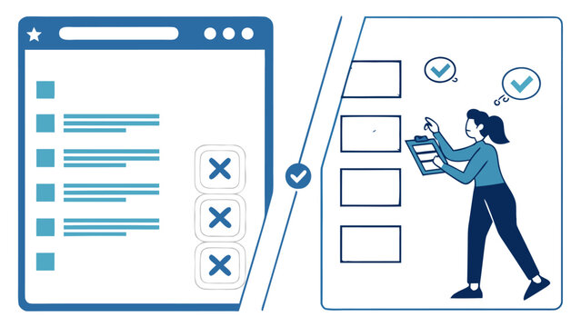 Illustration of a person completing a checklist on a clipboard next to a digital interface displaying a list with multiple incorrect selections or rejections