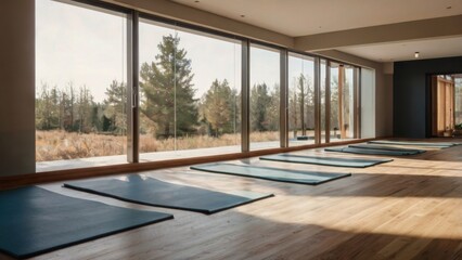 Modern yoga studio with large windows, multiple yoga mats and garden view.