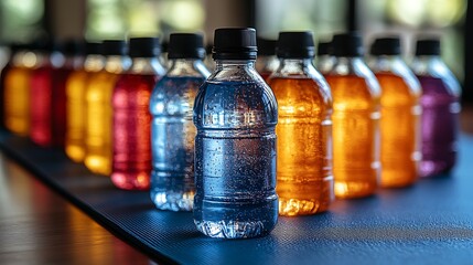 Colorful plastic water bottles in a neat row.
