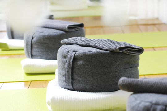 Several rolls of yoga props are lined up against a blue wall