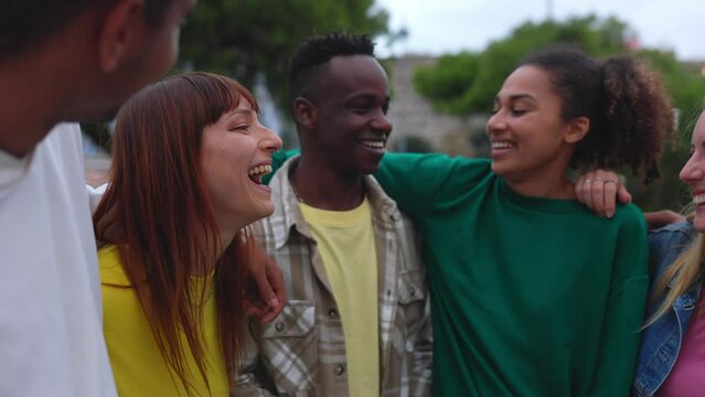 Slow motion video of united group of multiracial young friends standing together outdoors. Community and friendship concept with millennial people hugging each other while laughing and having fun.