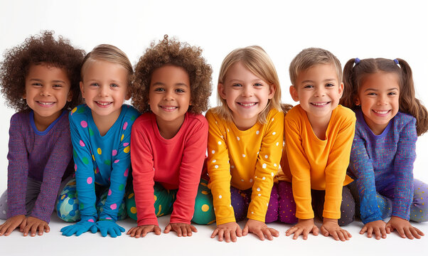 Happy diverse junior school students children group looking at camera standing in classroom. Smiling multiethnic cool kids boys and girls friends posing for group portrait together, Generative AI
