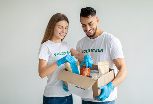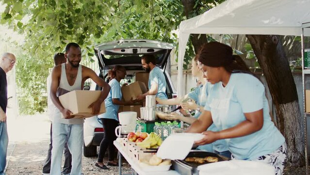 Diverse group distributing contribution boxes to those in need at a homeless and refugee shelter. Multiracial volunteers share essentials and provide support through a non-profit food bank. Handheld.