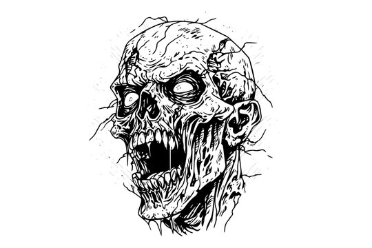 Zombie head or face ink sketch. Walking dead hand drawing vector illustration.