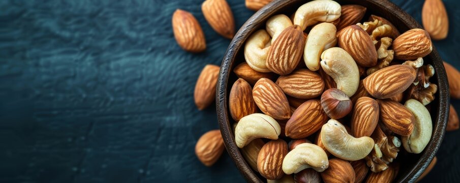 Assorted nuts including almonds, cashews, and walnuts in a bowl on a dark background. Healthy snack option.