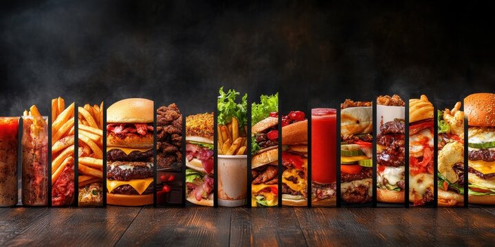 A vibrant display of various delicious fast food items with burgers, fries, and drinks, perfect for food lovers and marketers.
