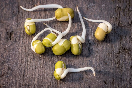 Close-up of fresh green sprouted mungo beans on rustical wooden board
