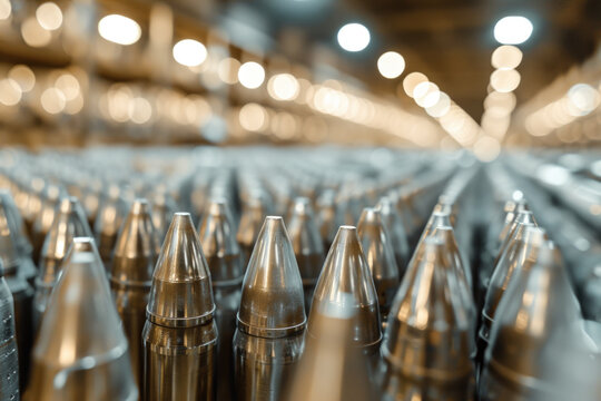 Many of new artillery shells are in military warehouse, metal munition in storage of weapons factory closeup. Concept of war, background, equipment, supply, production