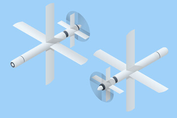 Isometric loitering munition. Kamikaze Drones Attack. Unmanned military technology. Air munition loiters around the target area for some time and attacks only once a target is located.