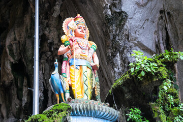Colorful statue of hindu deity lord murugan standing with peacock inside batu caves, a popular