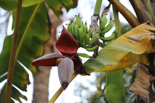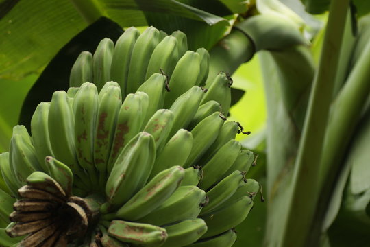 Musa acuminata fruits hanging down on tree closeup in the garden.