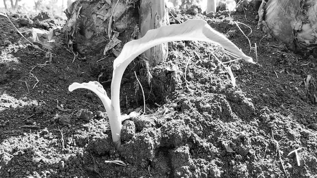 Black and white of newly planted banana tree. A banana tree is growing. Musa acuminata. Selective focus.