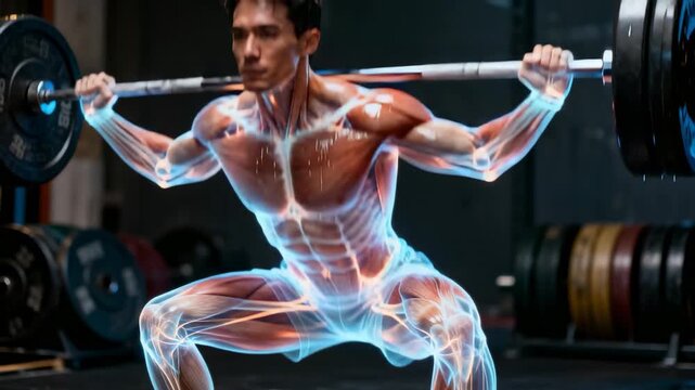 Anatomical weightlifting squat digital illustration. Bodybuilding and fitness concept. Exercise, strength training with barbell. Gym focus.