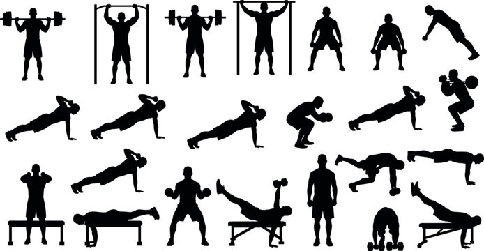 Silhouette vector of strength training, bodyweight exercises, gym workout poses, fitness movements, muscle building, health and wellness icons