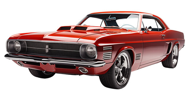 Side profile of a classic muscle car in metallic finish, a timeless symbol of American automotive heritage, studio view, isolated on transparent background.