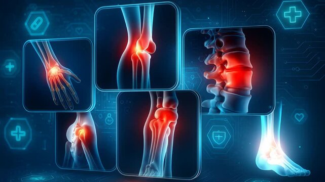 Highlighted Joint Pain Areas in Human Body X-Ray Scans Showing Inflammation in Spine, Knee, Wrist and Ankle