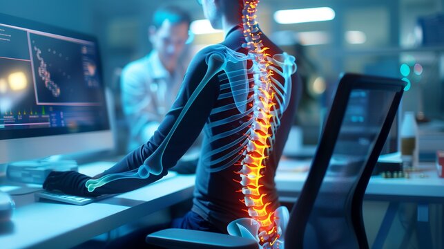 an illuminated backbone on a young man using technology to detect injury in the skeletal muscular health-themed, horizontal format of realistic illustration in JPG. Generative ai