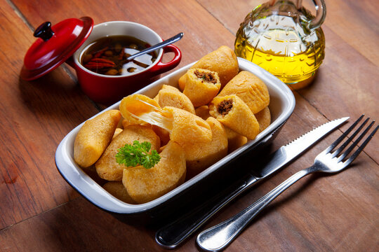 Tasty cornmeal mush with breads and basil leaves on kitchen table