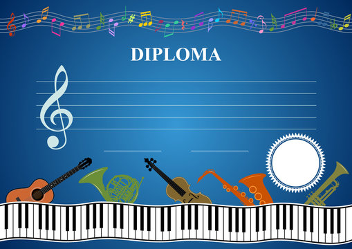 Kids diploma, cartoon musical instrument characters and music notes. Vector diploma or certificate of kindergarten music education with background frame of cute guitar, piano, drum, violin personages