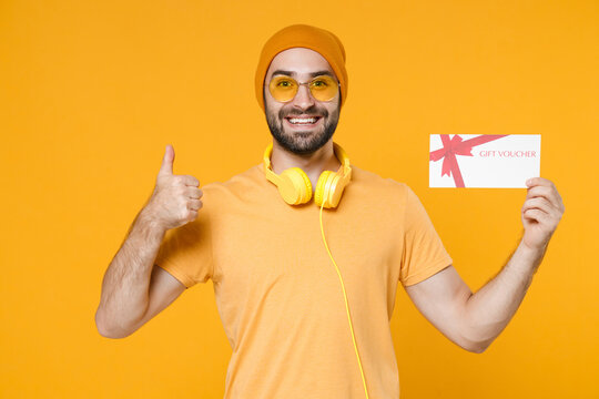 Smiling cheerful young bearded man 20s wearing basic casual t-shirt headphones eyeglasses hat standing hold in hand gift certificate showing thumb up isolated on yellow background, studio portrait.
