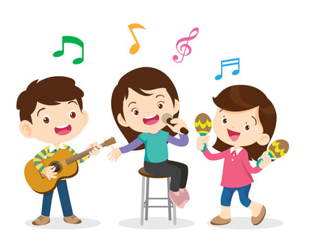 Group of excited children in the music class. Two cute little pupils girls with braids play with barabans at classroom. Back to school concept.
