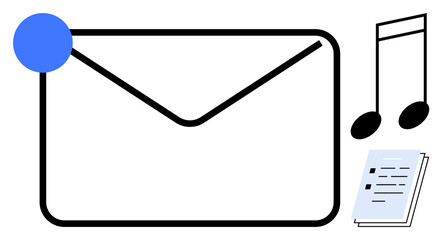 Envelope with blue notification badge, musical note, and document emphasizing interaction, multimedia sharing, and digital correspondence. Ideal for message, technology, email, file-sharing