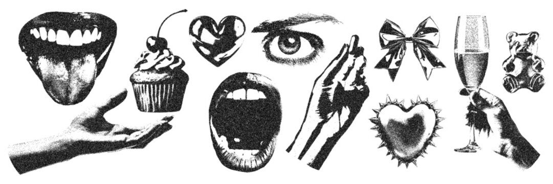 Eye, mouth, hand, heart, gummy bear with halftone stipple effect, for grunge punk y2k collage design. Pop art style dotted crazy elements. Vector illustration for vintage emo gothic banner, music post