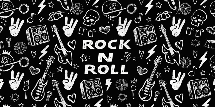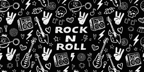 Hand drawn rock and roll music pattern with guitars skulls lightning bolts and peace signs