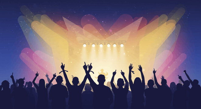 A vibrant flat design illustration capturing the electric atmosphere of a music festival, with a diverse crowd cheering and hands raised in unity.