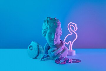 Speaker system for music in colorful background. Sound and audio equipment.