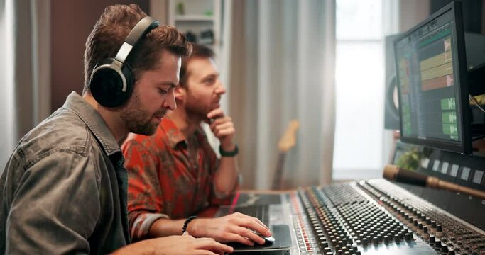 young male sound engineer working on a new music project in the studio
