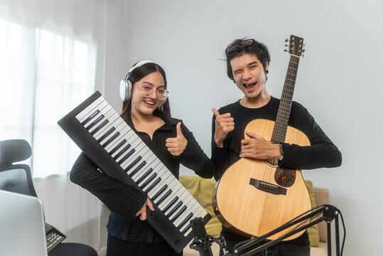 Gen Z couple sitting on sofa, talking and playing guitar and shaker while filming music blog with digital camera on tripod in living room at home