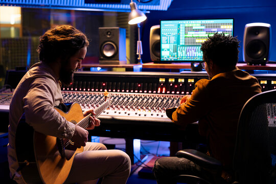 One man produce electronic music in project home studio. Sound and audio production in professional recording studio by producer